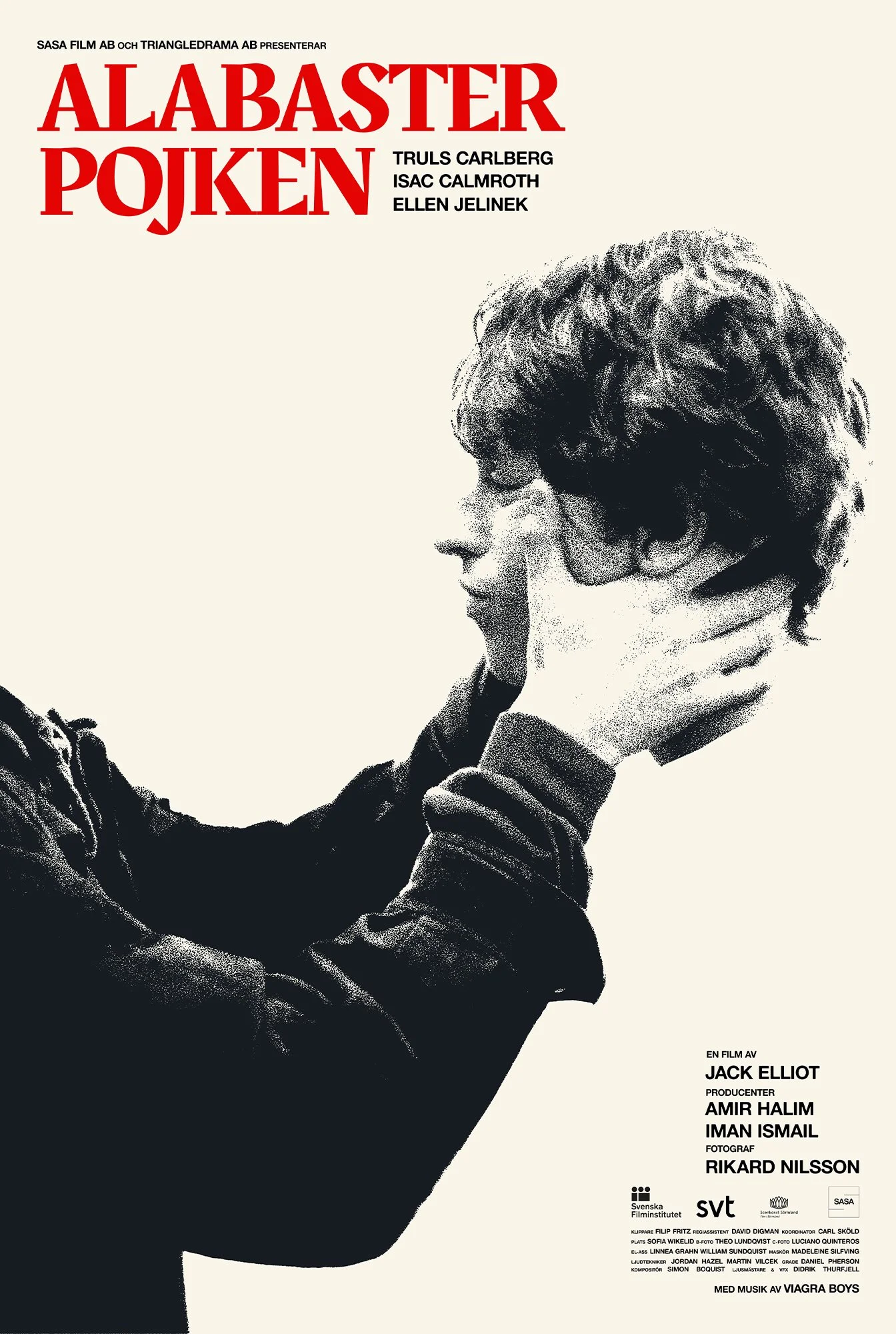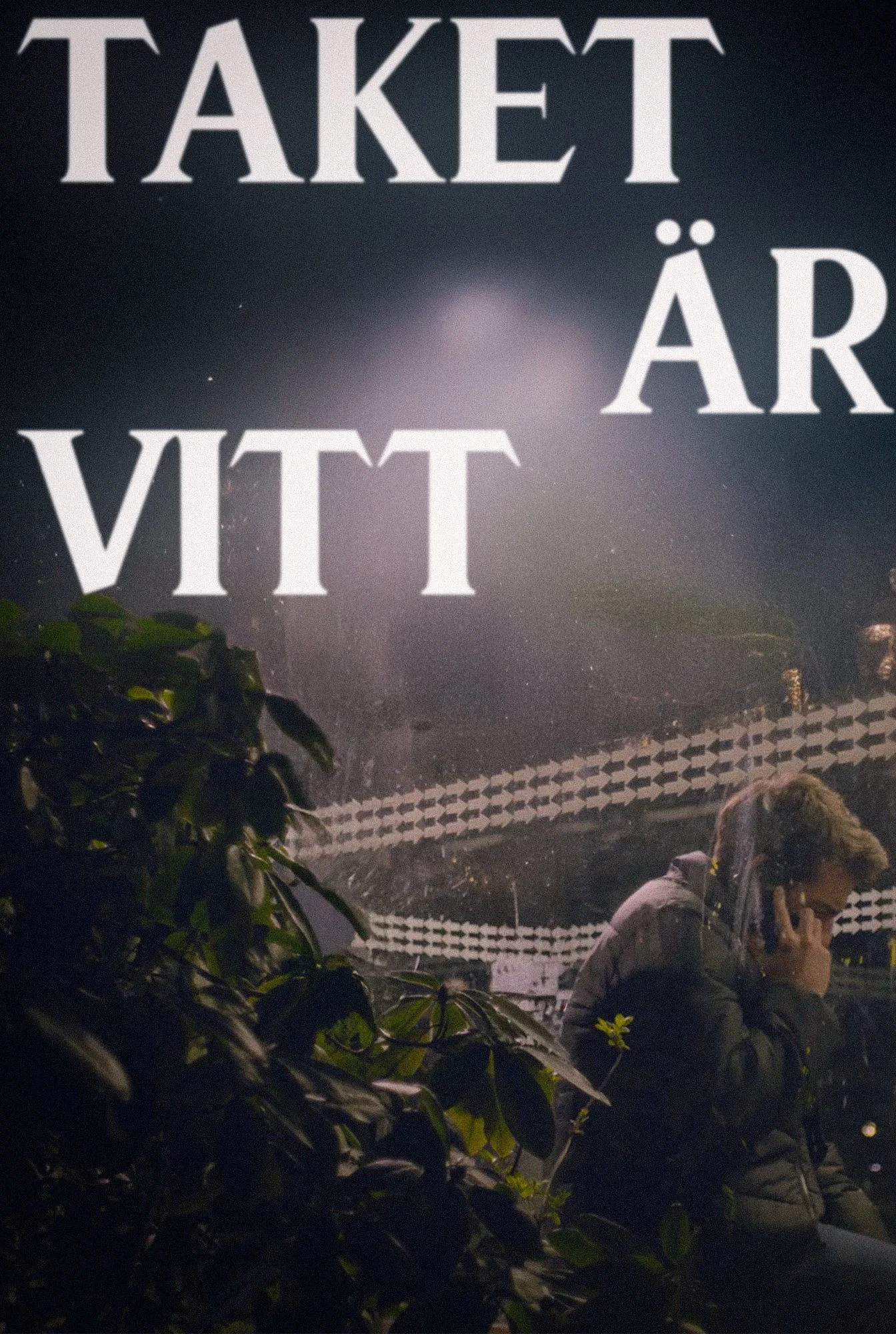 Movie poster for 'Amygdala' feautring A sign in Swedish that says 'Taket är vitt' with a person talking on a phone in the background, plants in the foreground, and a dark night sky.